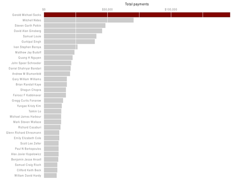 長條圖很適合用來做簡單的比較,此外,在這個圖內設計者還加上顏色來強調誰領了最多錢